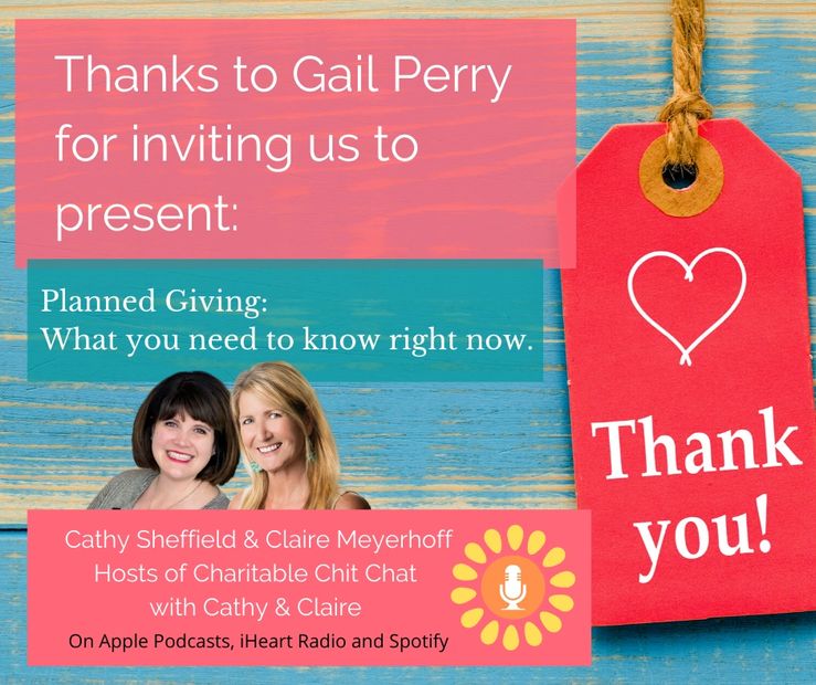We're glad you enjoyed our webinar hosted by Gail and that you're inspired to "do more" with planned giving and help your nonprofit raise more money with bequests, retirement plan gifts, Donor Advised Fund gifts and all those other gifts that go "beyond the checkbook." To help with that, we've curated some resources for you. If you need any help email Cathy@Thinkgiving.com or Claire@pgagency. We'd love to help you!